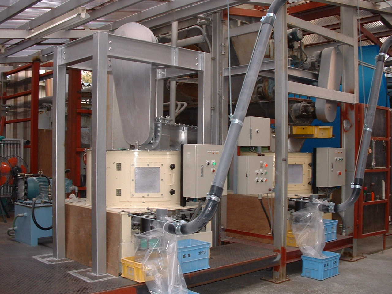 - 釦工場やプラスチック工場で切削工程ででた紛体を、連続してペレット状(直径 65㎜x厚さ 20㎜程度)に圧縮して自動排出させる減容圧縮機です。