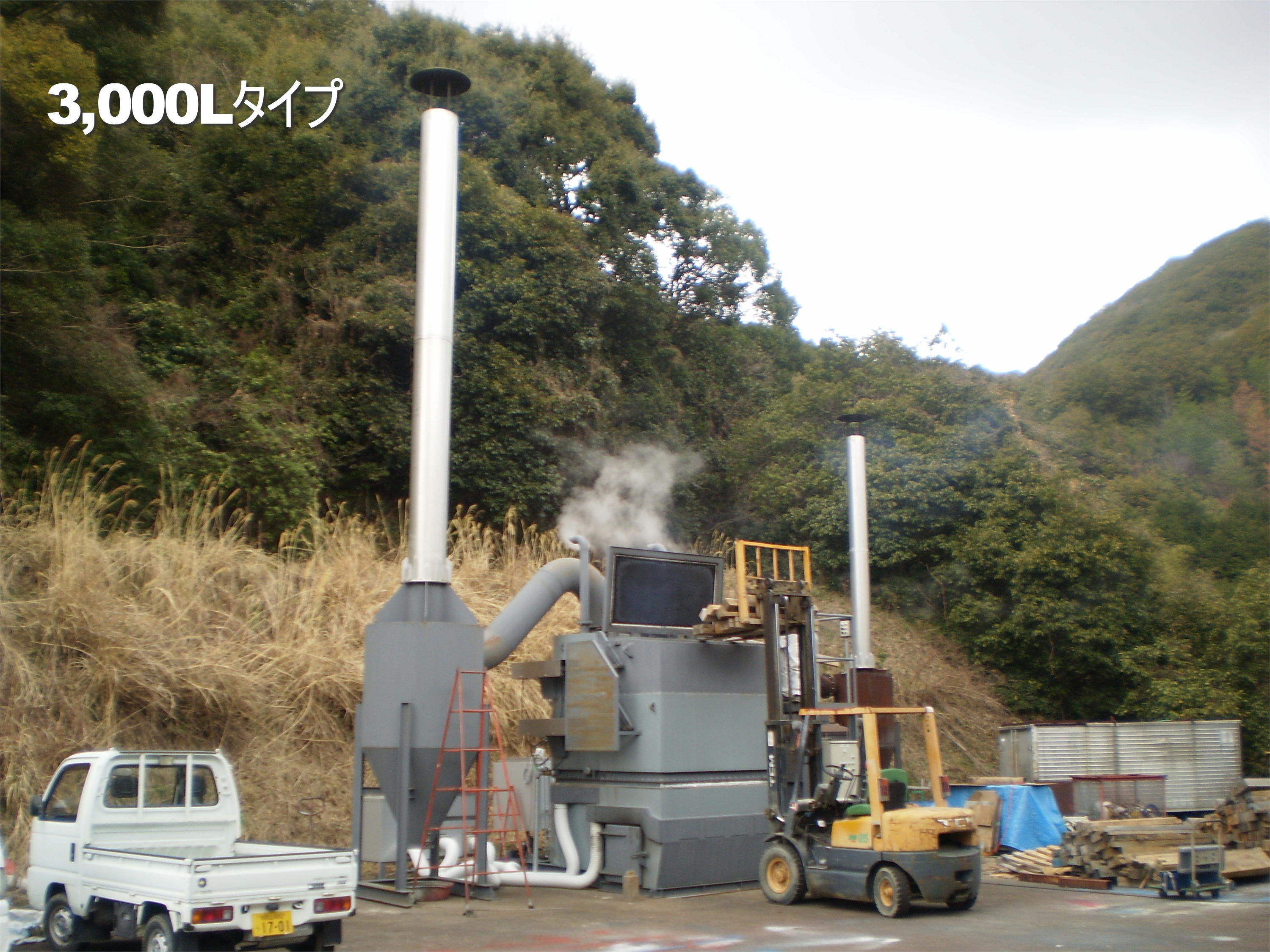 間伐材や選定枝,抜根,製材所から出る樹皮,端材を直接燃焼炉に投入でき、ガス化燃焼させて本体上部に内臓している水タンクを熱交換装置で加熱できます。